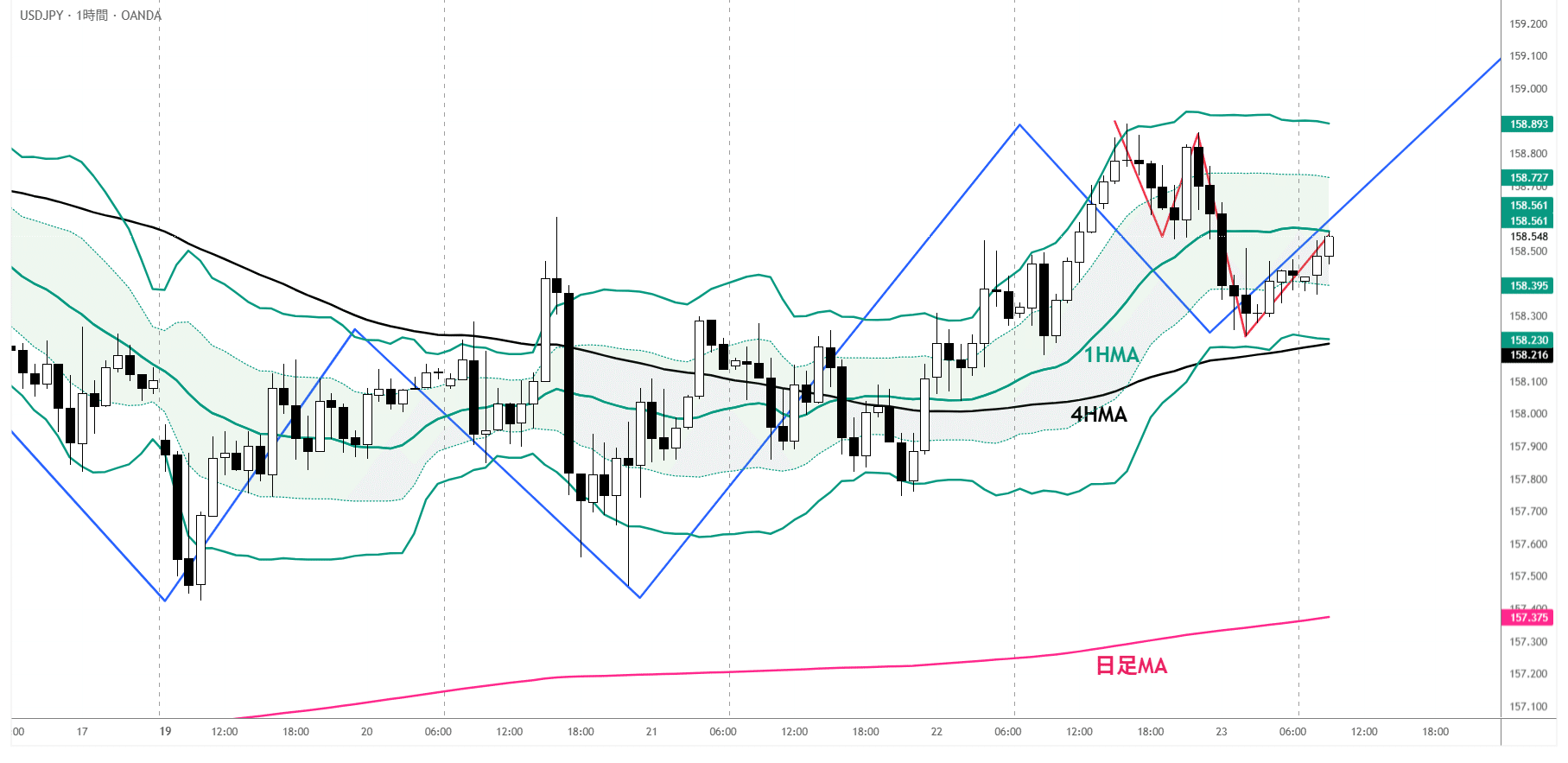 【移動平均線】1HMAが上から抑えてきているためいったん下降する可能性あり