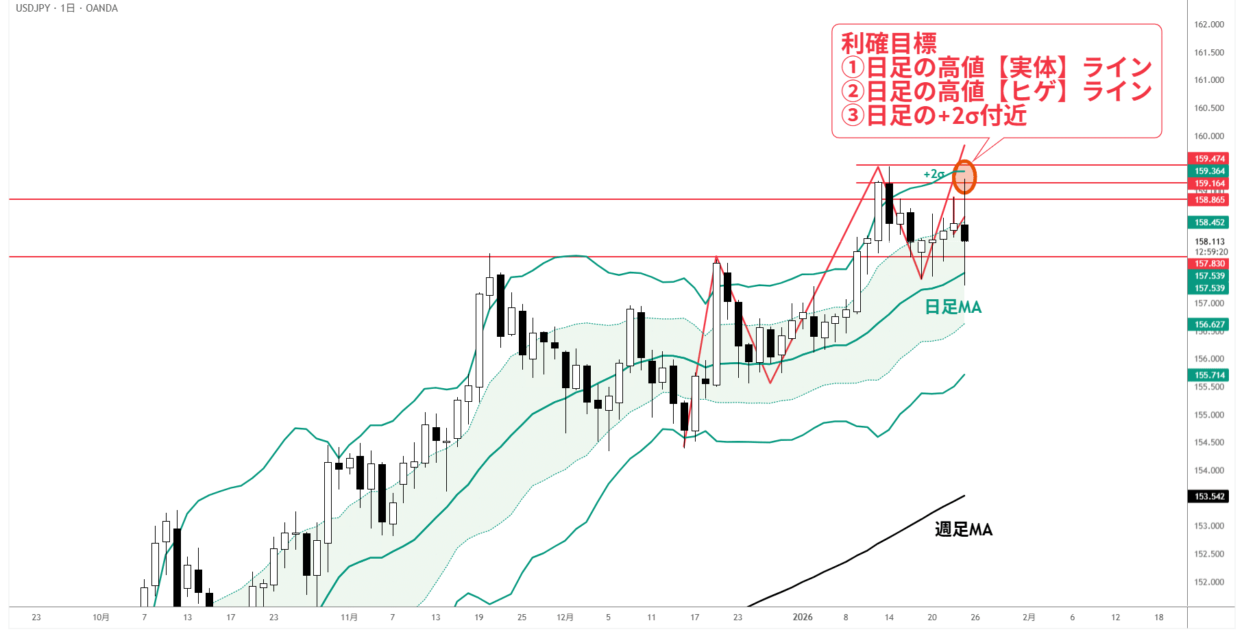 目標②▶日足の過去の高値「ヒゲ」ラインか日足+2σタッチ